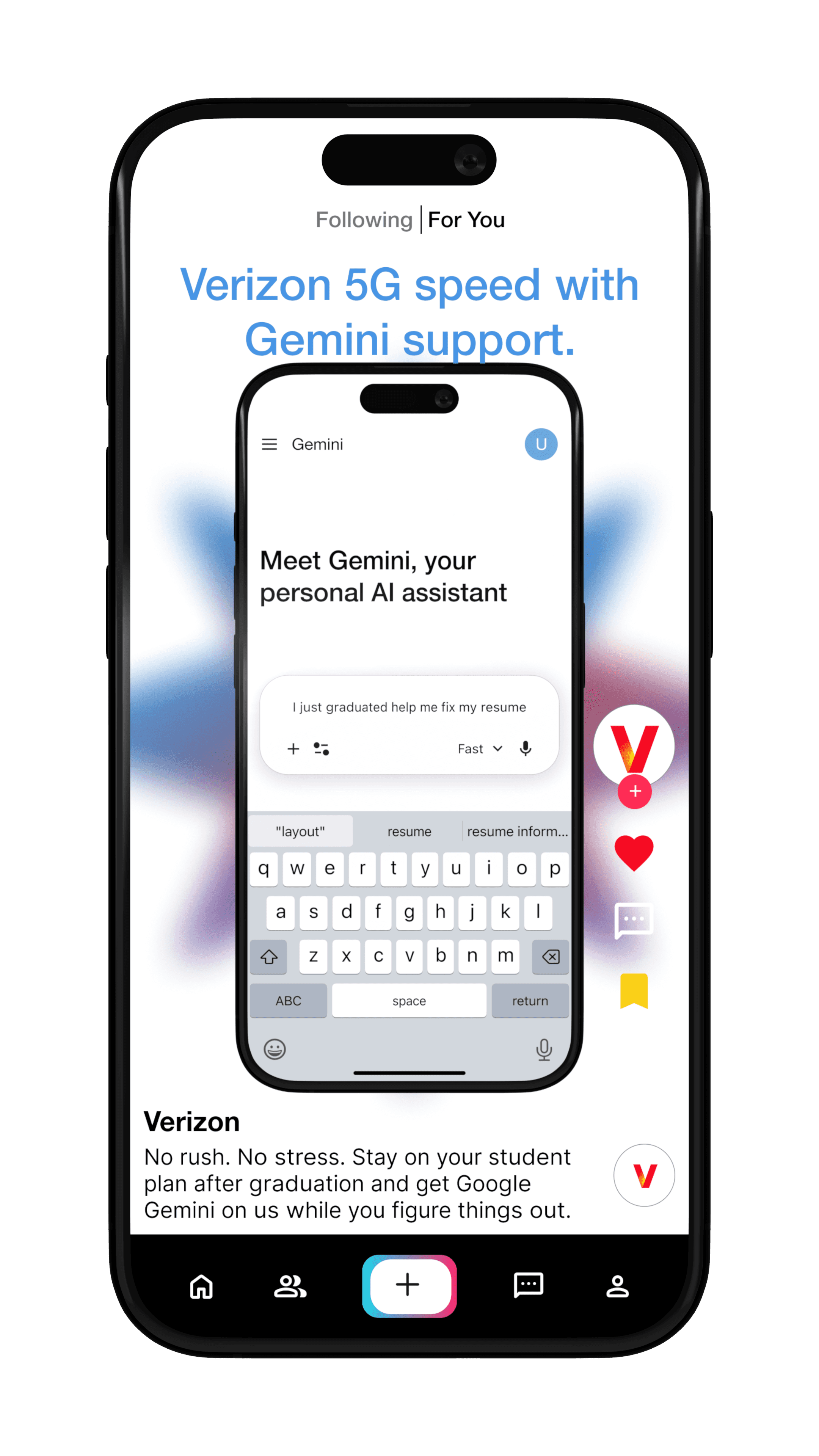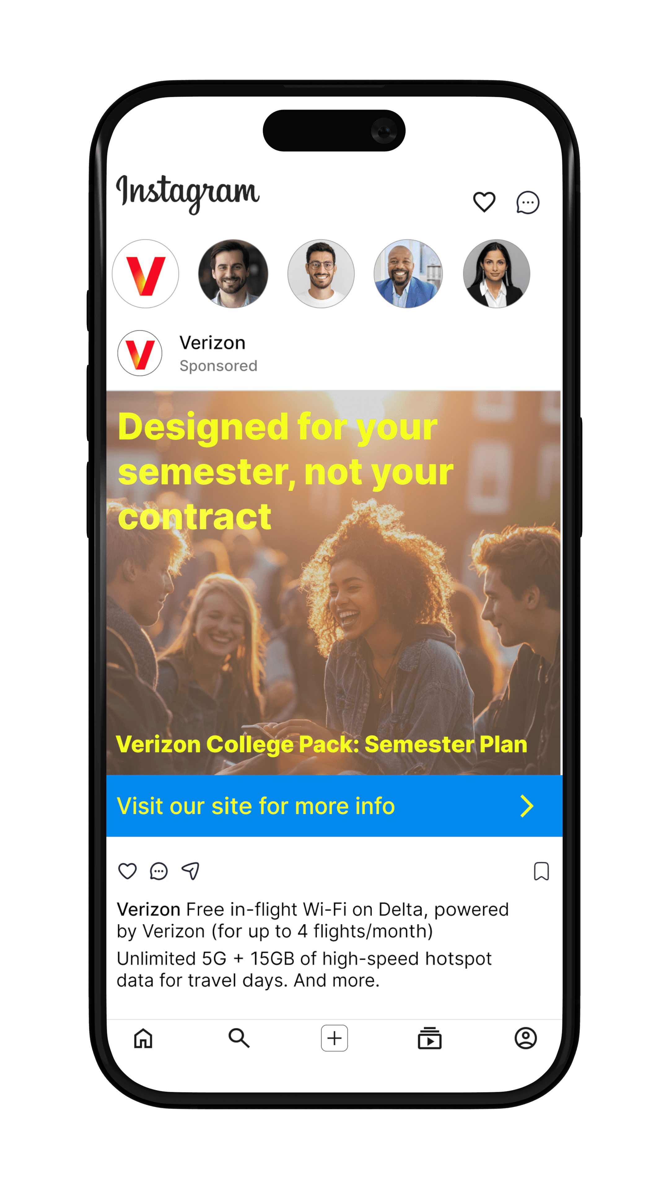 I worked on a group project for my Multimedia class, where we designed an ad campaign for Verizon. The client wanted ads that would appeal to their target audience, ages 18 to 34, and convince them that Verizon offers the best plan. Our proposal included student graduate plans, allowing graduates to continue on the student plan for three months and receive Gemini for free for six months. This plan aimed to attract younger individuals within the target audience. Additionally, we developed an airline plan in partnership with Delta, enabling frequent flyers to use Verizon's Wi-Fi on any Delta flight. I designed social media UIs to showcase how these ads would appear on users' feeds and smaller screens.